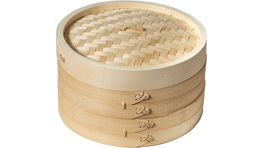 When you want steady steam and consistent dumpling texture, lid seal performance matters: a tight-fitting lid that nests into the top basket keeps heat in and cuts cooking time, while a slight overhang and good rim contact lets the steamer sit securely on different pots without constant adapters. You’ll want a dome-shaped lid that redirects condensation back toward the food to avoid soggy bottoms and maintain even circulation. Choose natural bamboo lids that are lightweight enough to absorb and redistribute moisture; they help regulate humidity better than heavy metal lids that can trap condensate and change steaming dynamics. Inspect for warped edges or visible gaps—loose-fitting lids waste water and add minutes per batch, which can ruin delicate dumpling texture.