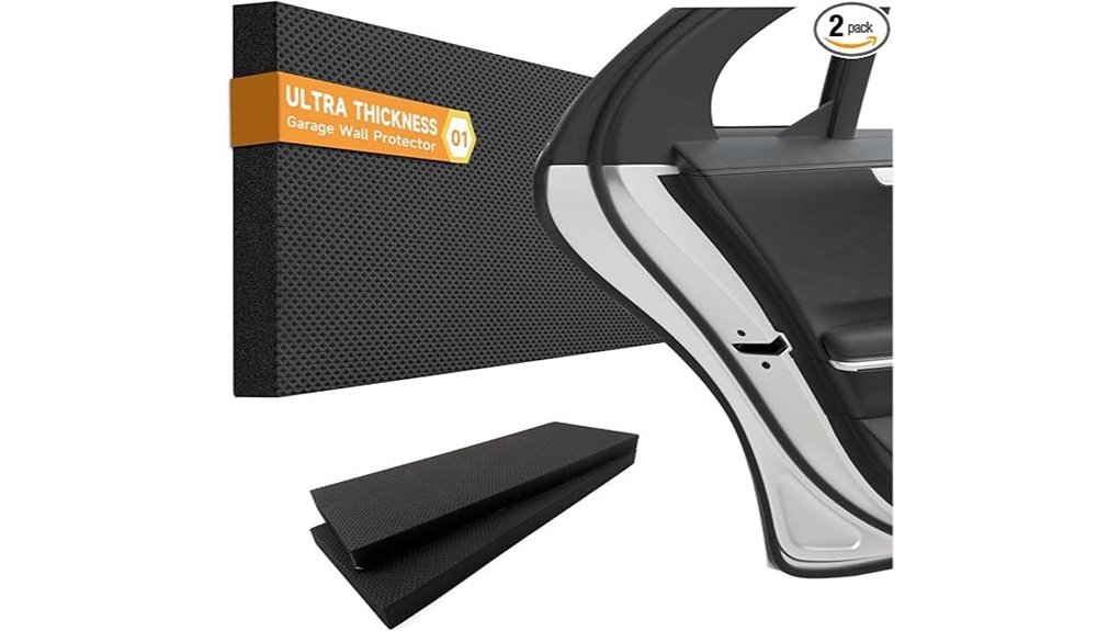 For anyone parking in tight, compact garages, the Spigen Garage Wall Protector EVA Foam (2-Pack) delivers quick, reliable door-ding protection with its shock-absorbent EVA core and peel-and-stick installation. You’ll get two sleek black pads that cushion doors and bumpers, resisting dents, scratches, and paint chips while retaining shape over time. The universal fit works on most garage walls and doors, and the EZ Peel plus mesh fabric tape gives a strong hold without sticky residue. Each lightweight unit installs in seconds. Warranty details and a voluntary 30-day retailer return are available if you need them.