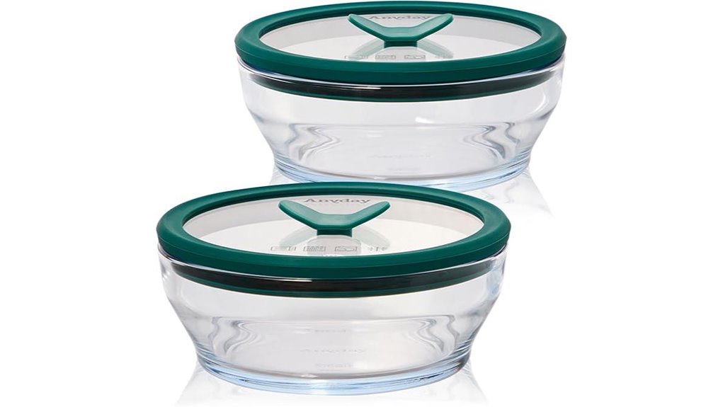If you cook for one or pack small lunches, the Anyday 2-Pack Glass Food Storage Set with Lids is a smart pick: two 2-cup borosilicate bowls with airtight, twist-lock glass lids give you leak-resistant, plastic-free storage that moves safely from freezer to oven (bowls to 500°F, lids to 400°F) and back to the table. You’ll appreciate the vented, lay-flat knob that you press to seal or pull to vent for microwaving. These stackable, space-saving rounds are microwave-, freezer-, and dishwasher-safe, weigh 3.45 pounds total, and hold 2 cups—ideal for leftovers, meal prep, sauces, and snacks.