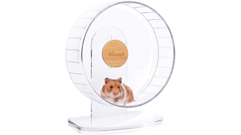 You’ll want a well-balanced wheel with dual stainless-steel bearings, a wide continuous tread, and an axle-free or hidden-bearing design to cut squeaks and prevent tail or spine injuries. Options like Niteangel’s medium wooden or transparent models, plus 8–10” dual-bearing plastic wheels, give quiet, smooth spins while protecting paws. Aim for 8–10″ for Syrians, 6–8″ for dwarfs, and consider hand-washable, bearing-care maintenance—keep going to see specific model picks and sizing tips.