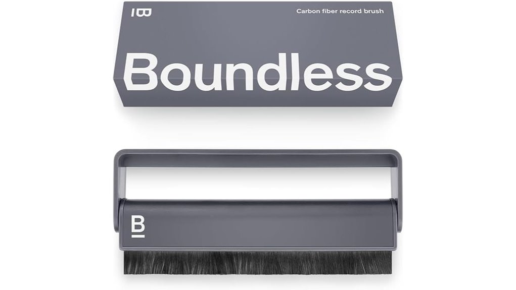 If you’re after a quick, no-mess pre-spin cleaner, the Boundless Carbon Fiber Anti-Static Brush is built for you. You’ll hold a lightweight, midnight grey aluminum-handled brush with dual-row carbon fiber bristles that gently lift dust without liquids. Its patented static-discharge design routes charge through your hand, cutting pops, clicks, and hiss before playback. Rounded edges and a self-cleaning handle protect grooves and shed debris, so you can use it every spin. At 4.45 x 1.3 x 0.67 inches, it’s compact, fits any kit, and suits novices, DJs, and audiophiles seeking fast, reliable vinyl maintenance.
