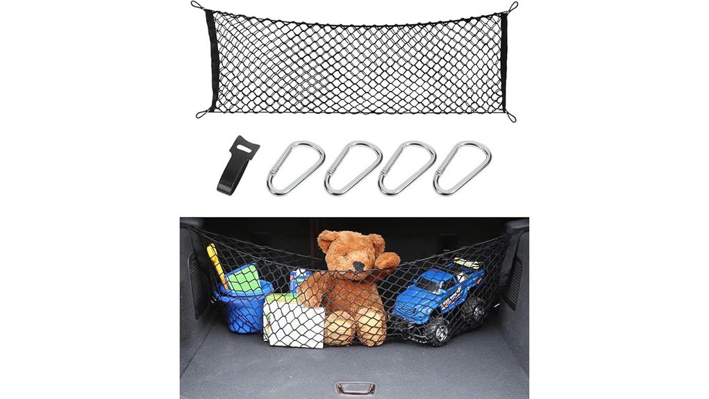Pick a snug, elastic cargo net with reinforced edges and sturdy metal hooks so your groceries won’t slide or roll during stops. Look for double‑layer nylon or military‑grade polyester that stretches to fit your trunk, snaps or hooks to factory anchors, and has small mesh openings so produce won’t slip through. Vehicle‑specific nets snap in for a tool‑free fit; universal nets work if you confirm anchor spacing. Keep going and you’ll find model choices, sizes, and install tips.