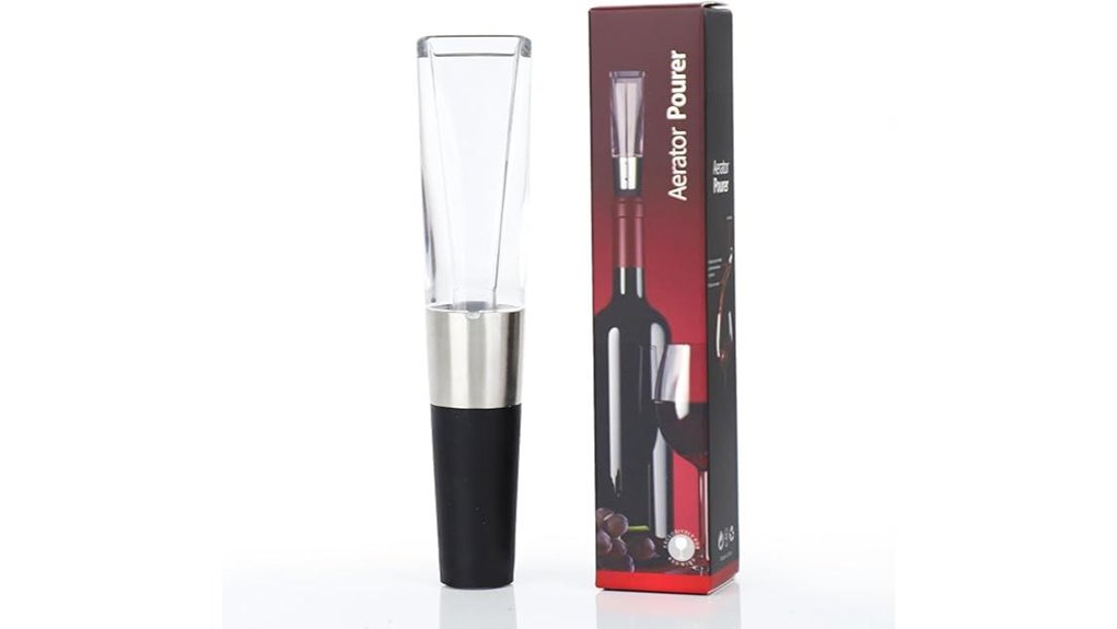Portability matters when you want great-tasting wine away from home, so pick an aerator that’s compact (about 1–6 ounces and under 6 inches) and light enough to slip into a picnic basket or carry-on. Choose a model with a protective case or small carry pouch to prevent knocks and keep it clean in a bag. Prefer designs that disassemble easily and use simple silicone stoppers so you can rinse and dry parts on the road without tools. Check that the stopper fits standard bottles universally to avoid lugging multiple adapters when you switch wines. If you need gift-ready presentation, select packaged options; otherwise opt for minimalist packaging to cut bulk and weight for travel.